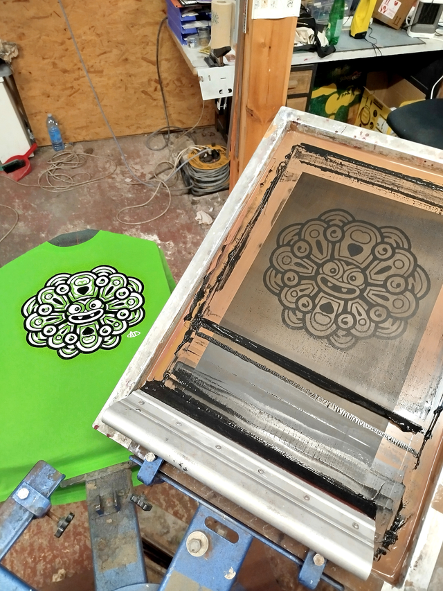 Sérigraphie artisanale en deux couleurs : Blanc Opaque + Noir sur teeshirt Citron Vert Flashy - Fruit of the Loom / Original T (100% Coton - 145 g/m²)