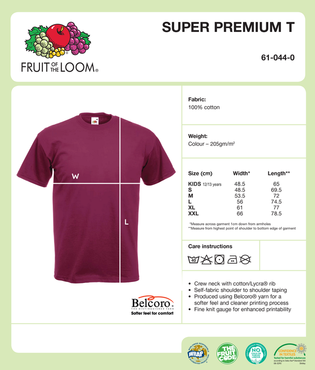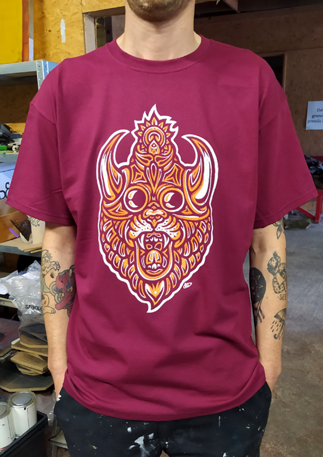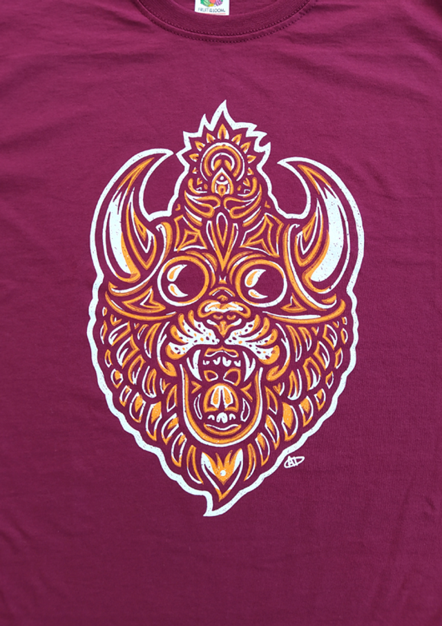 Sérigraphie artisanale en deux couleurs : Blanc Opaque + Orange sur teeshirt Bourgogne - Fruit of the Loom / Super Premium T (100% Coton - 205 g/m²). Teeshirt de qualité supérieure au grammage épais qui offre une durabilité et un confort exceptionnel !